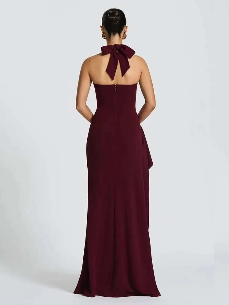 -16,00€Robe longue bordeaux fendue style soirĂ©e chic, dĂ©colletĂ© plongeant, sans manches et dos nu pour gala ou mariage, silhouette moulante.