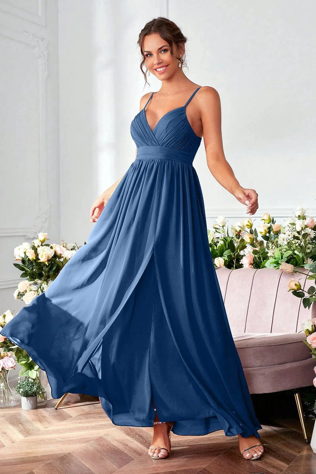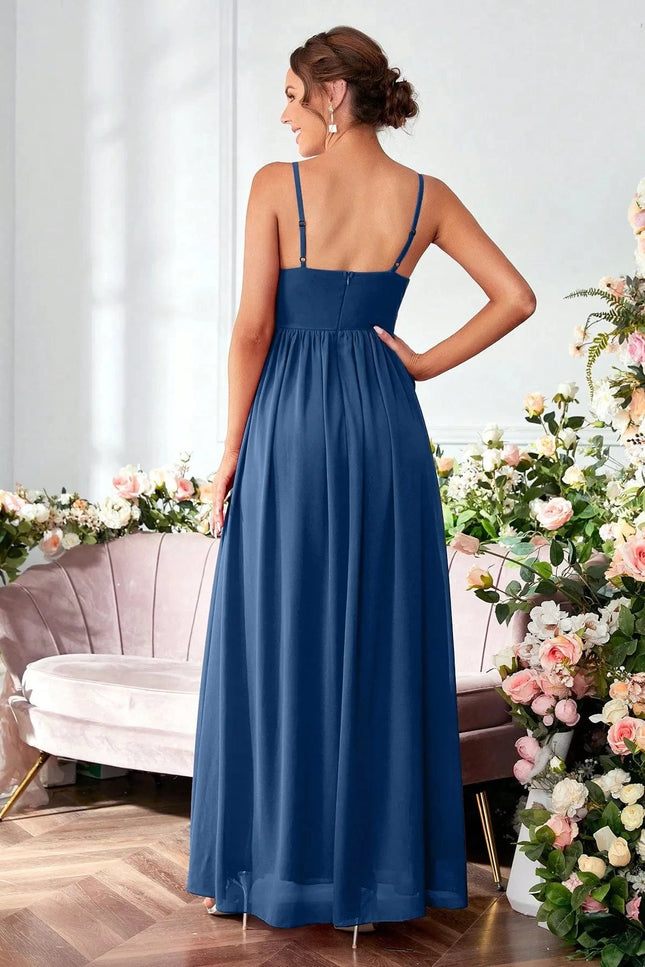 -32,00€robe de soirée mariage longue fluide bleu à bretelles décolleté élégante pour invitée chicrobe de soirée été fluide longue verte silhouette trapèze sans manches décolleté bretelles élégante