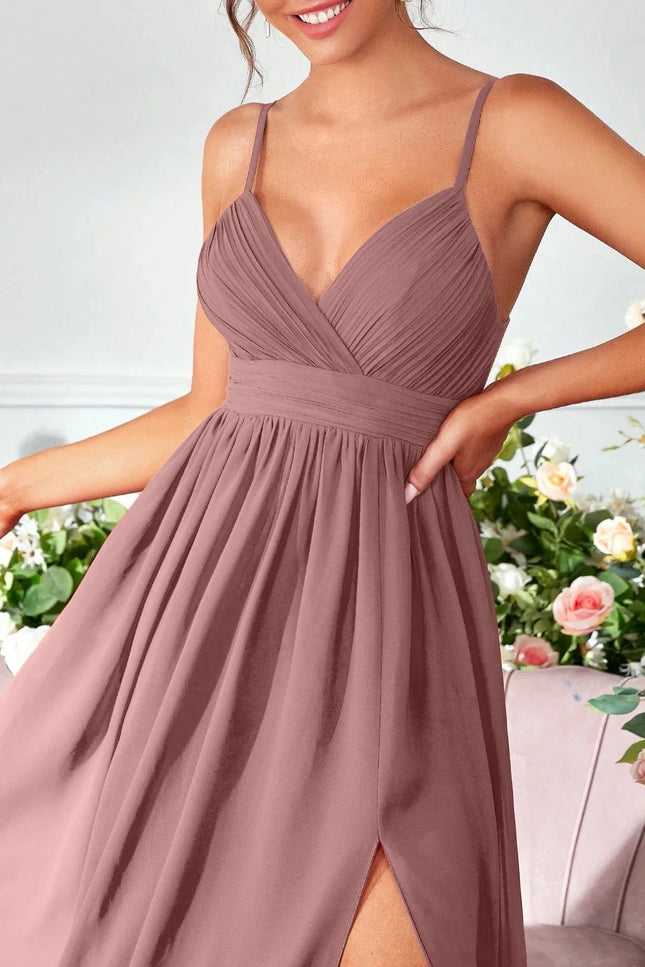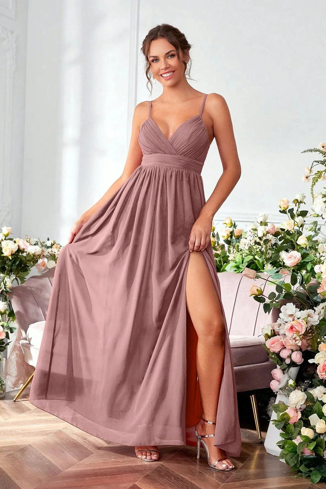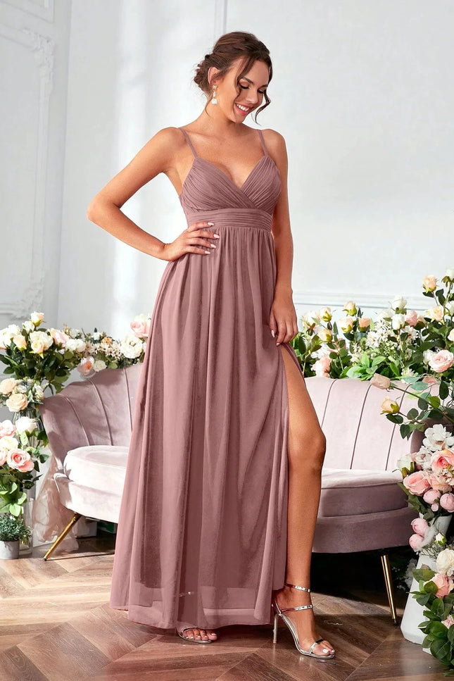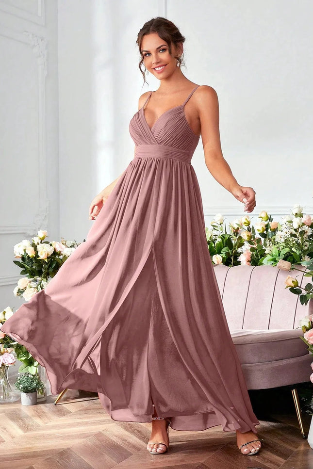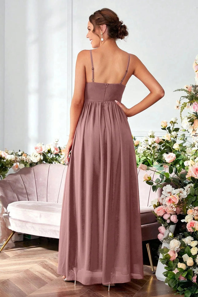 -59,00€Robe longue de gala rose poudré décolleté princesse pour soirée chic avec bretelles finesrobe de soirée princesse longue fluide pour gala ou mariage chic, style élégant et intemporel
