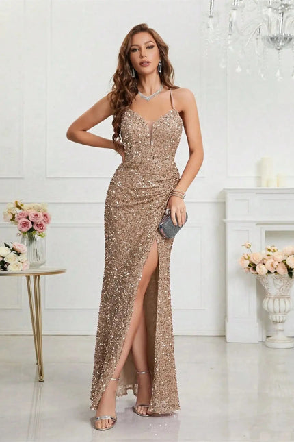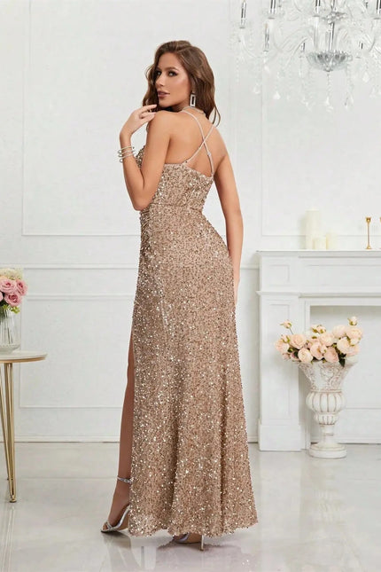 Illuminez chaque soirée avec notre robe de soirée sequin qui redéfinit l'élégance moderne. Cette silhouette parfaitement moulante épouse vos courbes avec un stretch léger pour un confort optimal toute la nuit. Le décolleté en V profond et les bretelles fines type spaghetti créent une allure sexy et sophistiquée, idéale pour les grands événements. Les sequins recouvrant intégralement cette robe longue captent la lumière à chaque mouvement, créant un effet hypnotisant sur la piste de danse. Associez-la à des accessoires minimalistes - une pochette métallisée et des escarpins fins suffiront pour sublimer cette pièce scintillante qui ne demande qu'à être admirée. Une création intemporelle qui transcende les saisons.