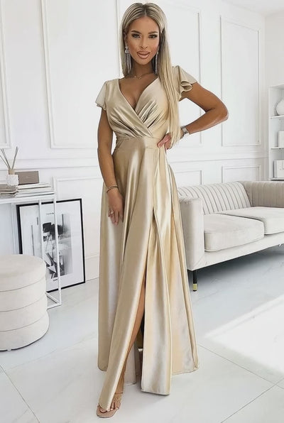 Dansez avec grâce et éclat dans notre robe dorée pour soirées en satin. Cette robe longue enveloppe votre silhouette avec élégance, mettant en valeur votre décolleté et vos jambes grâce à son encolure enveloppante et sa fente subtile au niveau des jambes. Parfaite pour une multitude d'occasions, cette robe dorée est un choix idéal pour les mariages, les soirées spéciales ou même une sortie entre amis.