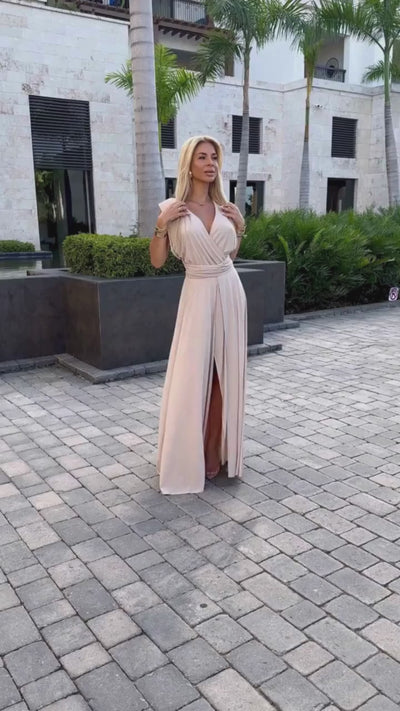 Incarnation de l'élégance et de la versatilité, cette robe longue transformable de couleur beige s'impose comme la quintessence de la garde-robe féminine. Conçue en Europe, cette création se distingue par son incroyable capacité à se nouer de multiples façons, s'adaptant à votre style unique et à toutes les occasions. La texture en brocart enrichit le tissu beige, offrant un éclat subtil et une sophistication indéniable. Cette robe longue est façonnée dans un tissu agréablement extensible qui épouse et flattera votre silhouette sans compromis sur le confort. Cet intemporel de la mode célèbre la beauté dans toute sa simplicité.