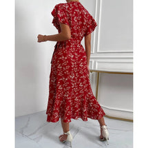 Embrassez le charme estival avec cette robe midi fleurie rouge avec manches volants