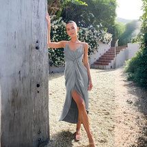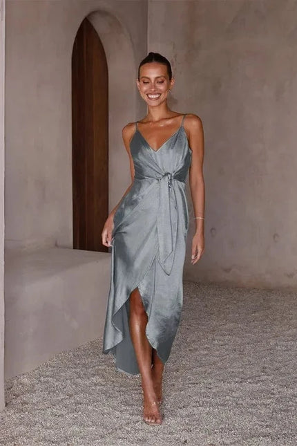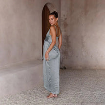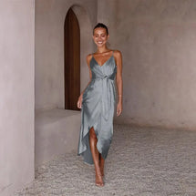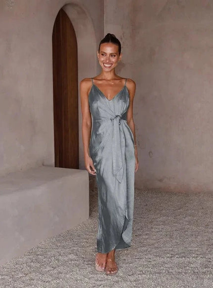 Sublimez votre silhouette avec notre robe argentée parfaite pour accompagner les plus beaux moments de la saison des mariages. Cette création se distingue par sa coupe A-line longueur cheville qui flatte toutes les morphologies. Les fines bretelles spaghetti et son bustier structuré mettent délicatement en valeur votre décolleté tandis que les plis soigneusement disposés apportent du mouvement à l'ensemble. Le tissu polyester haute qualité capture merveilleusement la lumière, faisant de vous le centre d'attention lors des célébrations estivales. Associez cette robe d'invitée avec des sandales à talons et une pochette nacrée pour un ensemble harmonieux. Pour les soirées plus fraîches, superposez un châle en mousseline ton sur ton qui viendra compléter avec élégance votre tenue de cérémonie.