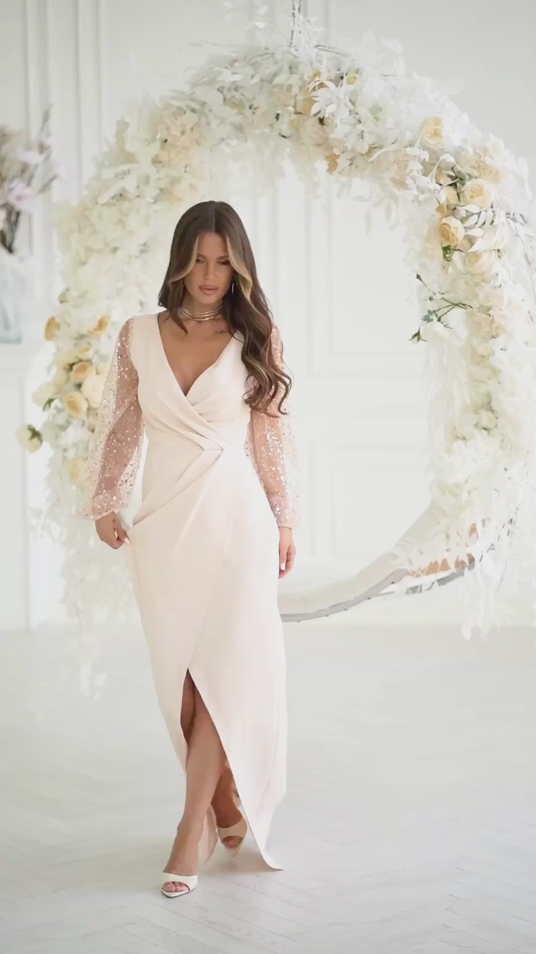 Robe de soirée mariage beige longue chic
